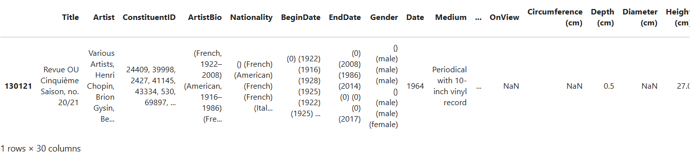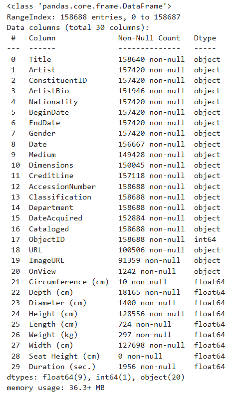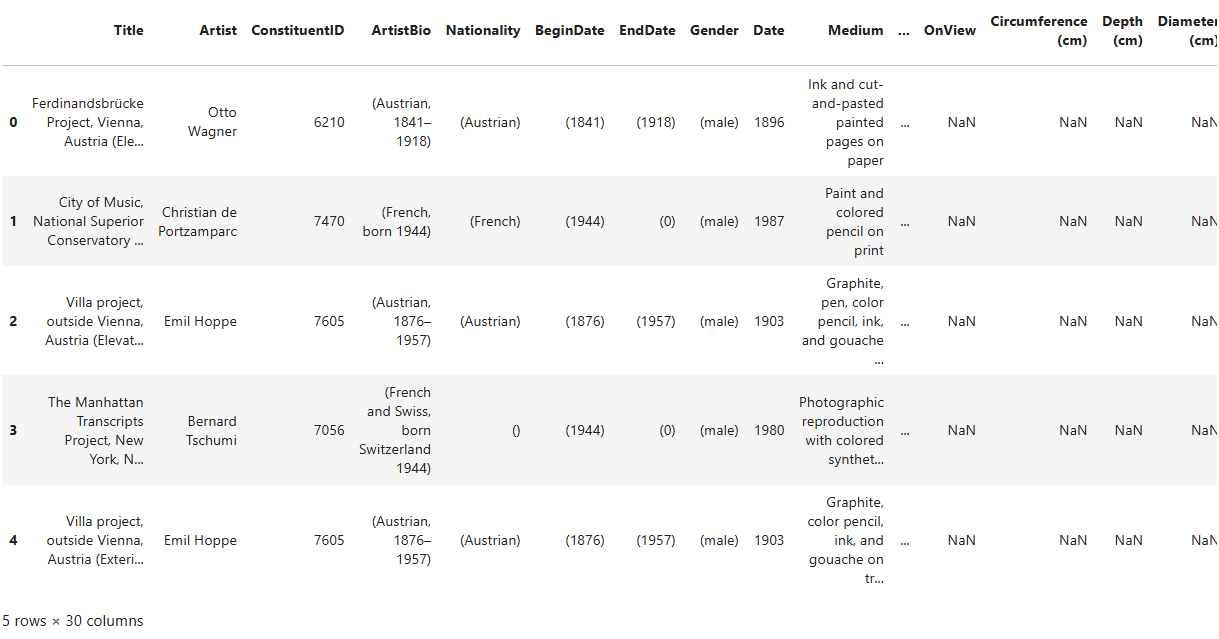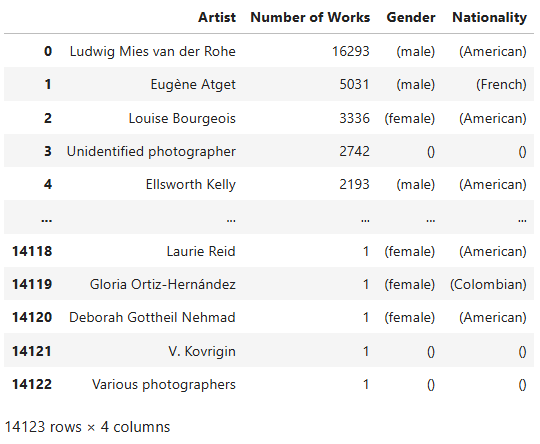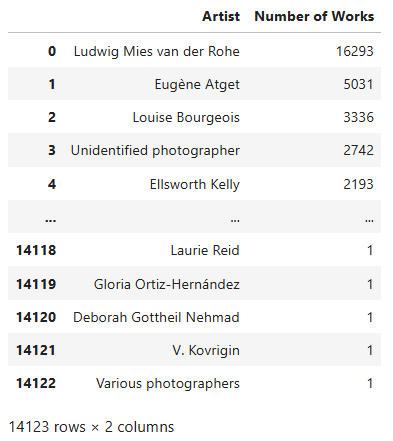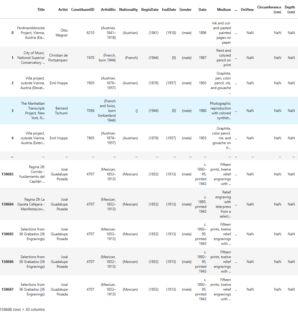 Let’s take on the role of an art historian in this chapter and analyze the MoMA dataset introduced in the Summary and Setup section. We’ll assume that we are completely unfamiliar with the dataset, its contents, structure, or potential usefulness for our research. The first step would be to look at this dataset and get familiar with its shape, dimension and different aspects. This initial stage of investigation is known as exploratory data analysis.
