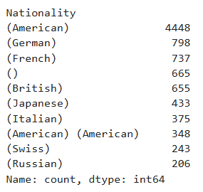 - Finds the 7 most common nationalities in the dataset by counting occurrences in the ‘Nationality’ column.