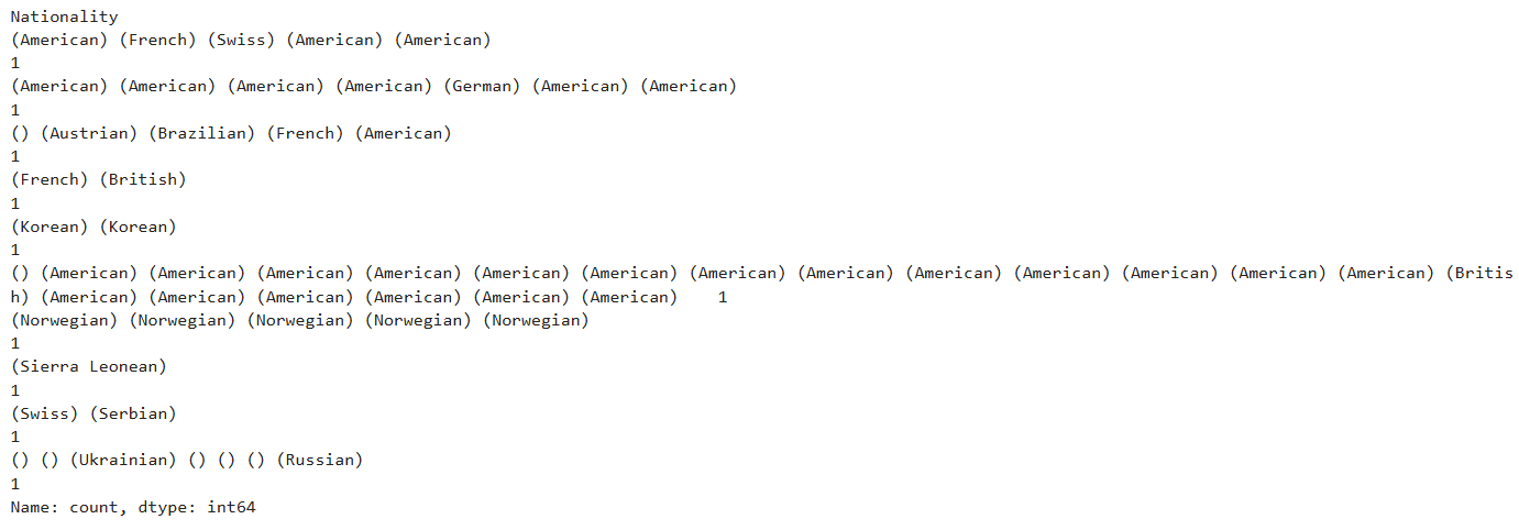 - This line should already be familiar to you. It groups the cleaned DataFrame by ‘Date’ and ‘Nationality’.