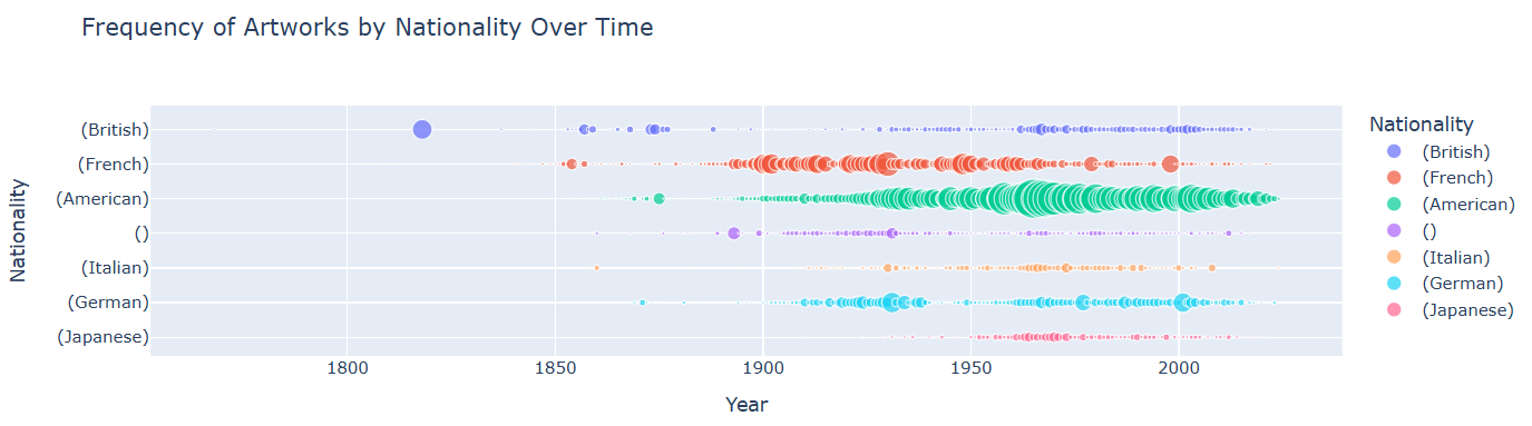 : size of the points represents how many artworks fall into each (date, nationality) combo. -